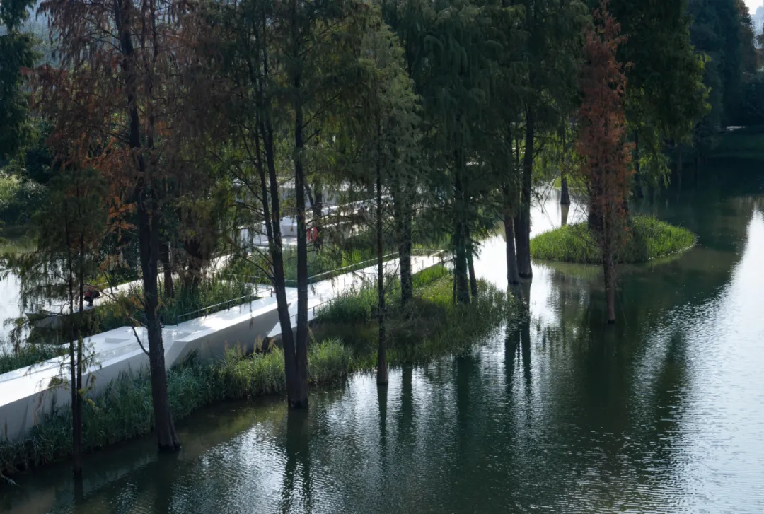 原生地塊是一片缺乏整理的疏林水塘,原生植物以落羽杉林最具特色。我們抓住林木間的縫隙,將景觀線條滲透其中,重組空間,整理路徑。