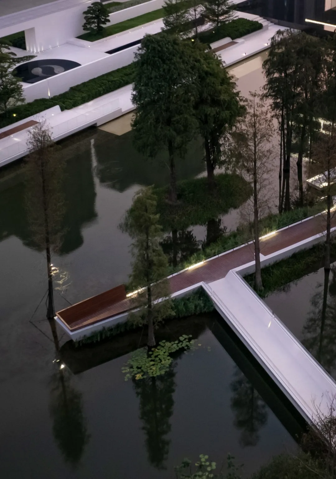 順德有“全國(guó)龍舟之鄉(xiāng)”的美譽(yù),龍舟文化源遠(yuǎn)流長(zhǎng)。本案順應(yīng)原有落羽杉的布局,采用現(xiàn)代的設(shè)計(jì)手法,打造水上泛舟之境。