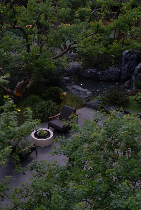 拾階而下,特色花鏡與疊石流水共同營造沉浸氛圍的下沉庭院,占地面積約706㎡,綠意盎然,譜寫一曲森林之歌。“芥子納須臾”,不出戶外而壺天自春。設計以小處收納天地,以匠心精巧,巧借天工。