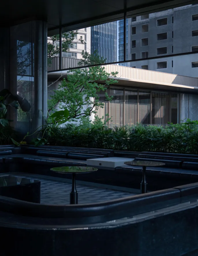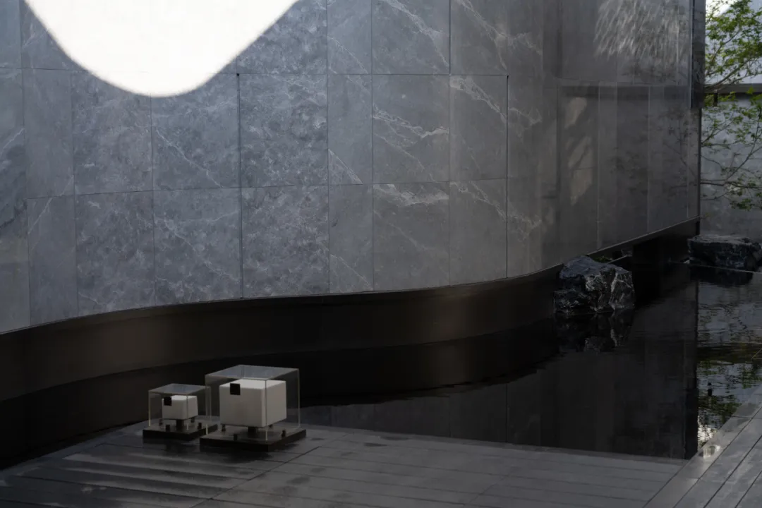 高差疊水配合黑山石的設置,在方寸里繪就一幅水墨小品,水筆不動,筆墨相連,清泉躍然,山石素雅,為空間增添生動氣韻。
