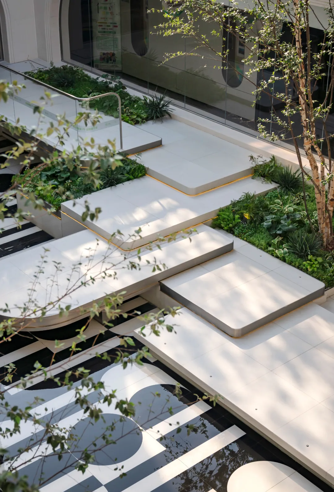 登上眺望臺(tái),俯瞰整個(gè)中庭水景的美景,心曠神怡,久違地忘卻生活的煩惱。中庭水景和瀑布營造出遠(yuǎn)離城市喧囂,貼近大自然的氛圍,讓人們仿佛置身于無憂無慮的真空當(dāng)中。