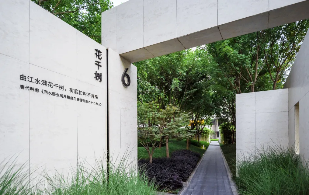 小區(qū)外是一片翠微林,四季青綠色的大葉女貞將小區(qū)和外面的馬路隔開,讓玫瑰園像一個(gè)被森林環(huán)抱的秘密花園,而花園里由銀杏、楓樹、紫薇樹、鵝掌楸、大葉女貞、松樹形成的六片主題純林,會(huì)隨著季節(jié)變化出不同的絢麗色彩。