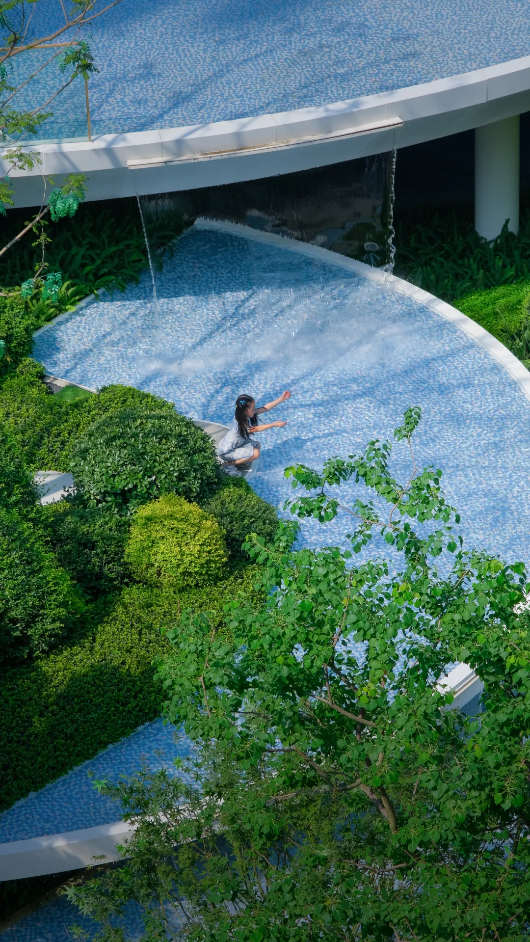 中庭空間內(nèi),由層層圓盤錯疊而成。白色的硬質(zhì)面、天藍池底與清透的的水光,結(jié)合成一座浪漫的空中花園。