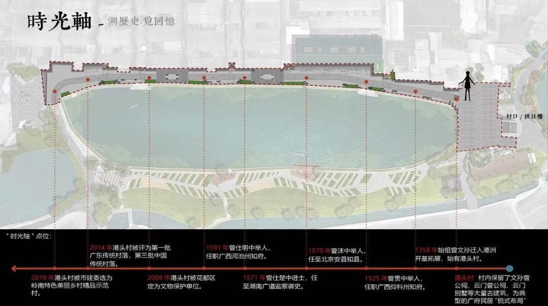 港頭村有著悠久而豐富的歷史文化,為使人們記得這些歷史,設(shè)計團(tuán)隊沿風(fēng)水塘一側(cè)打造了歷史文化時光軸。