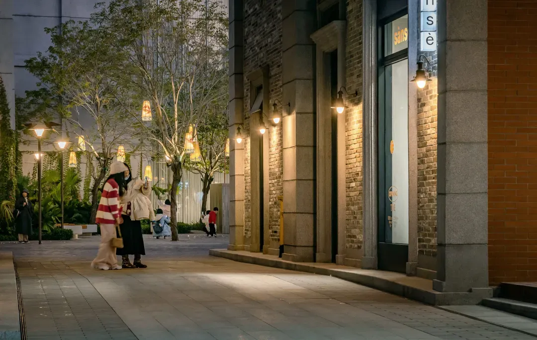 水景是吸引小孩活躍的主要原因,但小孩也被地面點光群吸引了,在星光里相互追逐。星塵灑落在他們腳下,這個有趣場景,卻在設計師意料之外。
